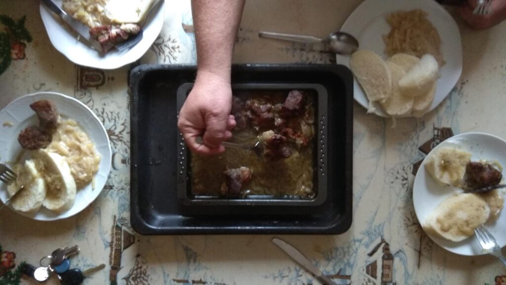 Csabának ugyan dolga lett volna már de hajthatatlan maradt, éhen nem indulhatunk útnak! Így hát kaptunk frissen sült húst káposztával és knédlivel.